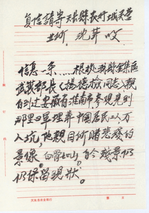 信息一条……根据我县金集区武装部长<杨德检同志>,亲自到过安徽省淮南市参观,见到那里日军埋葬中国居民工人万人坑,他亲目所睹悲惨的景像。白骨如山,自今残影仍仍保留现状。