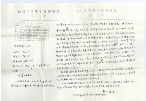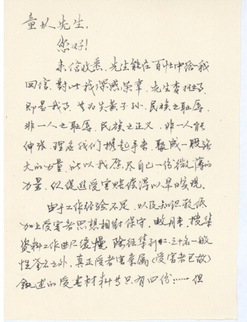 来信收悉,先生能在百忙中给我回信,对此我深感荣幸,先生委托之事即是我事。身为炎黄子孙,民族之耻辱,非一人之耻辱,民族之正义,非一人能伸张,理应我们携起手来,聚成一股强大的力量。所以我愿尽自己一份微薄的力量,以促进受害赔偿得以早日实现。