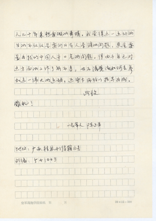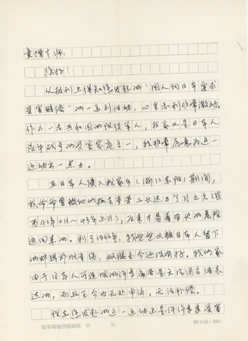 从报刊上得知您发起的“国人向日本要求受害赔偿”的一系列活动,心里感到非常激动。作为一名共和国的现役军人,我家又是日本人侵华战争的受害家庭之一,我非常愿意为这一运动的出一点力。