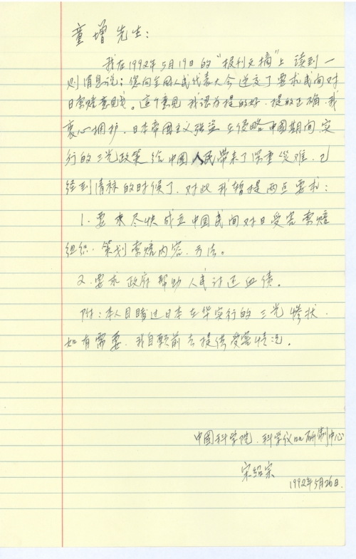 我在1992年5月19日的“报刊文摘”上读到一则消息说:您向全国人民代表大会递交了要求民间对日索赔意见书。这个意见我认为提的好、提的正确,我衷心拥护,日本帝国主义强盗在侵略中国期间,实行的三光政策给中国人民带来了深重灾难,已经到清算的时候了,对此我暂提两点要求: