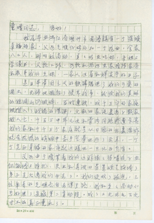 敬爱的童增同志,我深知你是专攻国际法的,你的法律知识丰富,我们这一代人的悲惨遭遇只有寄希望与你们这一代人了。