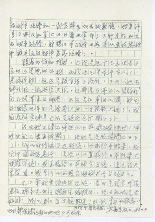 当我从报章上读到1990年8月九名日本古稀老人收到了美国布什总统给他们每人弎万美元的战争赔偿和一封言辞[恳]切的致歉信,1991年许多日侨及加拿大的日裔也拿到了三仟多亿加元的战争赔偿。我想日本政府也应该从速考虑给中国平民的战争受害赔偿了。