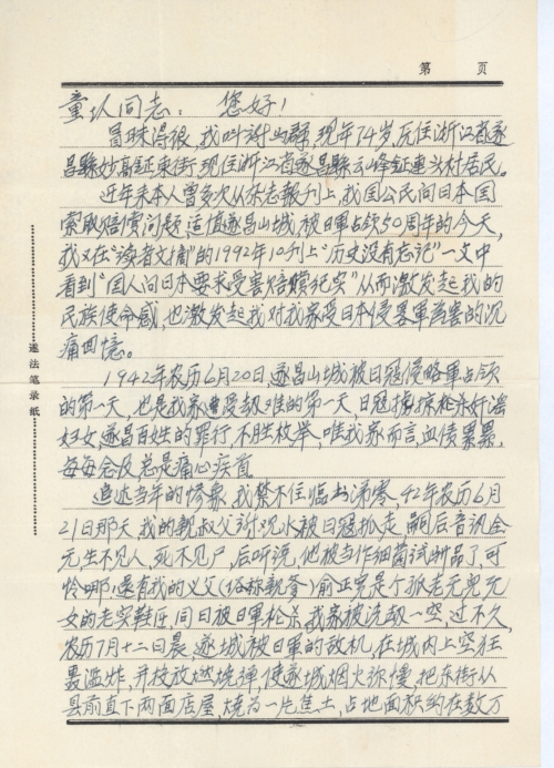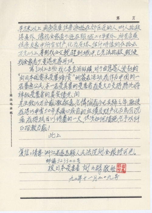 写了以上这些,我已是老泪纵横,对于由您等人发起的“向日本国要求受害赔偿”的签名活动,我作为中国的一名普通公民,亦一名受其害的受害者,我是大力支持,特此将详叙受害者的真实情况,向先生致以万分感激敬意,乞怜悯我今已古稀之年,能使我得以申雪50年来痛心疾首的血债及财产化为乌有沉痛,我将拭目以待着的一天,但须如何措施,[祈]予以纠正指教为感!