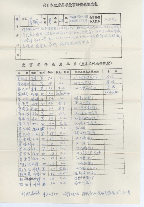 向日本政府要求受害赔偿的签名表