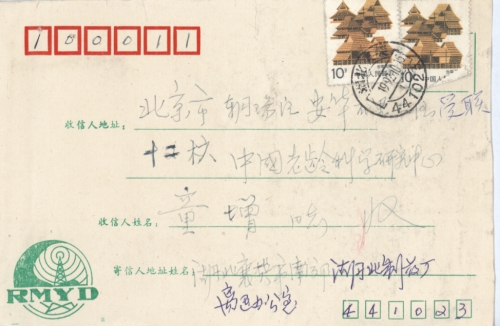 在采取上述办法与你取不上联系之后,我先后到过襄樊市人民政府办公室、人访接待室、老干局、老龄委、市人大、市政协、市红十字会诸单位,拿着材料和他们交流“对日索赔”问题,求教他们该怎么办(我想对日索赔是大事,政府可能有安排),回答的是一样的;上面没有指示,无可奉告。十月十三日,我第二次去市人民政府找市长,因值班市长不在,我又去老龄委谈了与你联系不上的情况,于是一位陈同志很热情,从档案柜内翻出了一份《中国老龄科学研究中心》的一份刊物,把我很长时间想得到的你的地址和邮编号给解决了。为我给你写信提供了条件。