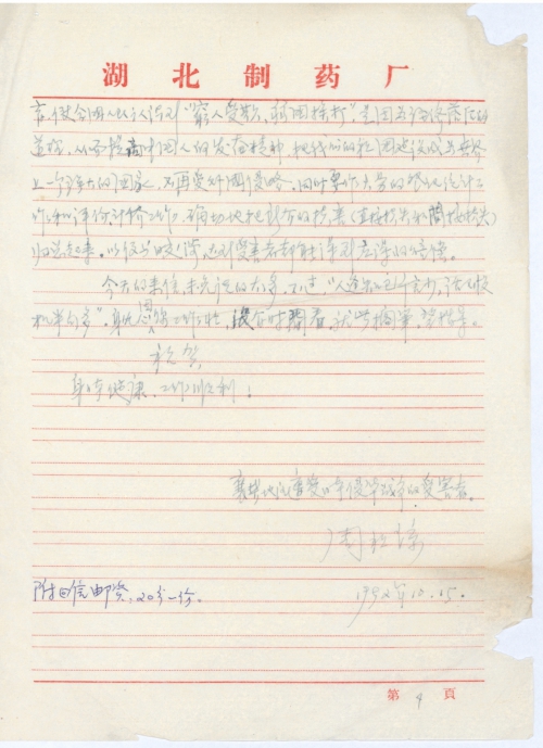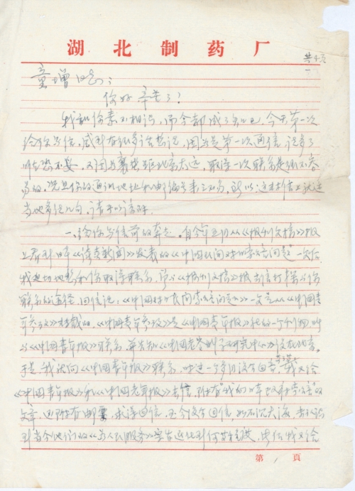 我和你素不相识,而今却成了知己。今天第一次给你写信,感到有很多话想说。因为是第一次通信,谈多了唯恐不妥。又因为襄樊距北京太远,取得一次联系是很不容易的,况且你的通信地址和邮编号来之不易,所以,这封信上就适当地多说几句。请予以谅解。