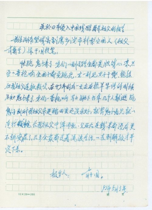 快跑,鬼子来了,它们一到,百姓全都是胆战心凉,只要一音枪响,全围子都要跑光,它一到见女子奸淫,抢[劫]。但我祖父连抓数次,在43年的有一天正在抗旱紧张的时候,不知鬼子来了,它们一音枪响,马上跳下卡车,几个人就逃跑。鬼子到时,我祖父[躲]进稻田里还没[躲]好,就[被]鬼子看见,就一连打数枪。后我祖父中弹而死,父死后连钱、米都没有,更不讲安葬了。后来全家都过着流浪生活,一直到解放才平定下来。