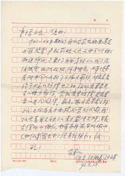 1941—44年期间我们全家在湖南遭受日寇侵害,导致家破人亡,父母与二个姐姐相继惨死,只剩下我和弟妹三人成了流浪孤儿,此仇此恨,终身难忘,日本侵害者对中国人民犯下了滔天罪行,对受害者给予必要的赔偿也只能弥补受害者失去的极少部[分],索取受害赔偿,是受害者的共同愿望。获知您为受害者主持正义,已向有关方面提出索赔问题,我仅代表我兄妹三人表示坚决支持,并表示深切的谢意,如有条件在东北做的(如征集签名等)请来信联系。