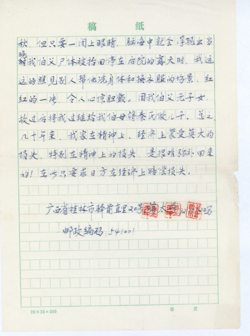我伯父蒋靖西,残疾人(几乎九十度的驼背。)四三年下半年从我家广西省临桂县六塘镇上桂林做生意时,途中遇见广西大学(该校校址当时在临桂县雁山)校车上桂林,于是搭乘此车前往。不幸的是,该车在驶往桂林的途中,遭日军跟踪扫射,车人所有的,除个别人跳车幸免于难外,其余者,伤的伤,死的死。最可怜的是我的伯父是位残疾人,怎敢跳车,其后果更不堪设想,身上连遭多发机枪子弹,而悲惨地死去。此事已时隔五十个春秋,但只要一闭上眼睛,脑海中就会浮现出当晚我伯父尸体被抬回停在后院的露天时,我远远的瞧见别人帮他洗身体和换衣服的场景;红红的一片,令人心惊胆颤。因我伯父无子女,故后来将我过继给我伯母蒋秦氏做儿子。总之,几十年来,我家在精神上、经济上蒙受莫大的损失,特别在精神上的损失,是很难弥补回来的!在此只要求日方在经济上赔偿损失。