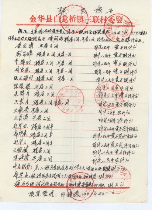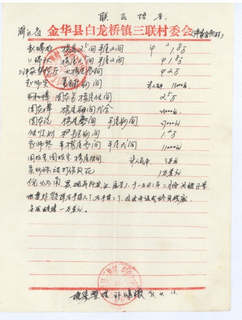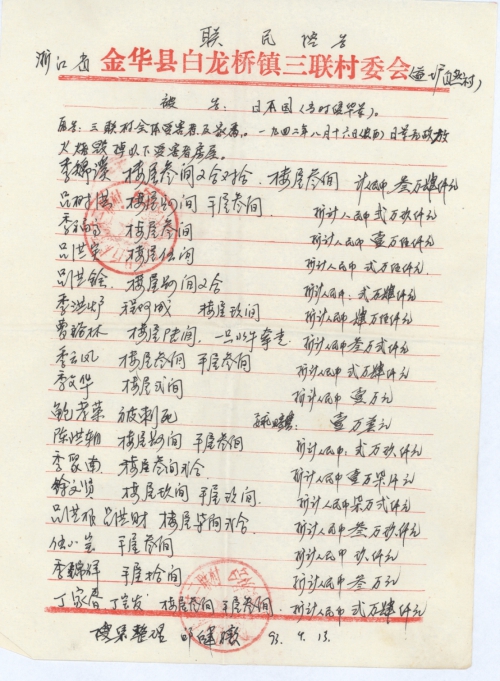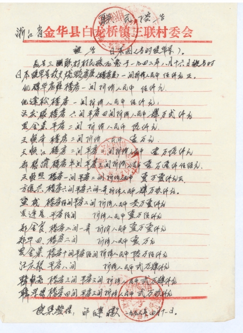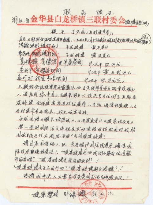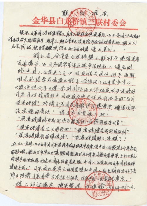 浙江省金华县白龙桥镇三联村全体受害者及家属认为日本侵华军违反战争法规和人道原则。给中国人民带来了巨大的灾难,是用任何东西都难以补偿。要求依据《雅尔塔协议》、《开罗宣言》、《波茨坦公告》等一系列国际法文件规定发动侵略的日本国对战胜的中国依法尽快支付应有必要的“民间受害赔偿”,特请日本国负有维护法律尊严,确保国际法实施的责任!请日本国重视人权!