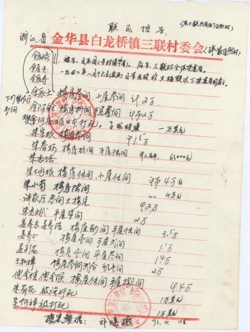 原告:三联村全体受害者及家属。一九四二年八月十六日(农历)日军无故放火烧毁掉以下受害者房屋。