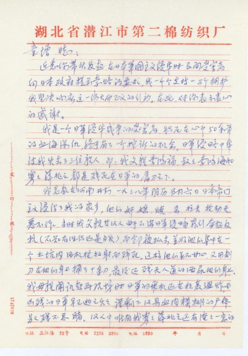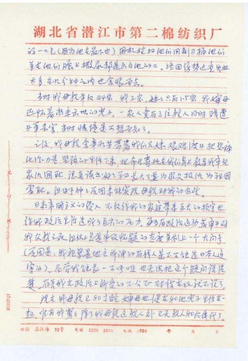 日本帝国主义的侵入,不仅给我的家庭带来巨大的损害,也给我政治生活造成了巨大的压力。每当有政治运动或审干对我父亲之死,组织上总是采取怀疑的态度并划上一个大问号。(原因是:我祖辈是地主,所谓的有钱人,是不可能[遭]日本人迫害的)。尽管我能长一百张嘴也无法把这个疑问说清楚。有关我在政治上所受的不公正对待,在此就不说了。