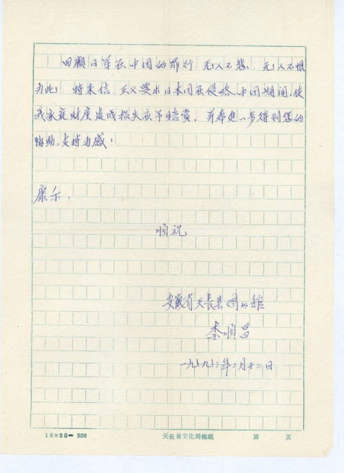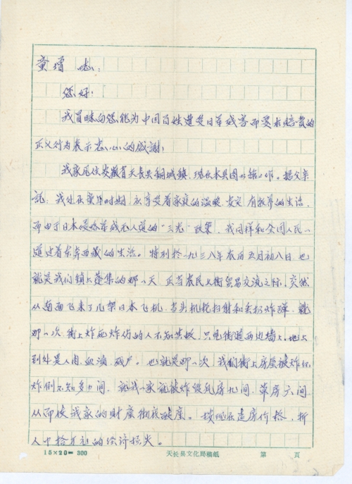 回顾日军在中国的罪行,无人不悲,无人不恨。为此,特来信,正义要求日本国在侵略中国期间,使我家庭财产造成损失应予赔偿,并希进一步得到您的协助,支持为感!
