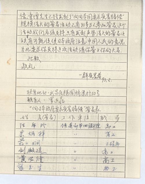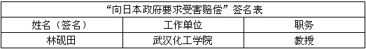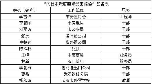 “向日本政府要求受害赔偿”征集签名表