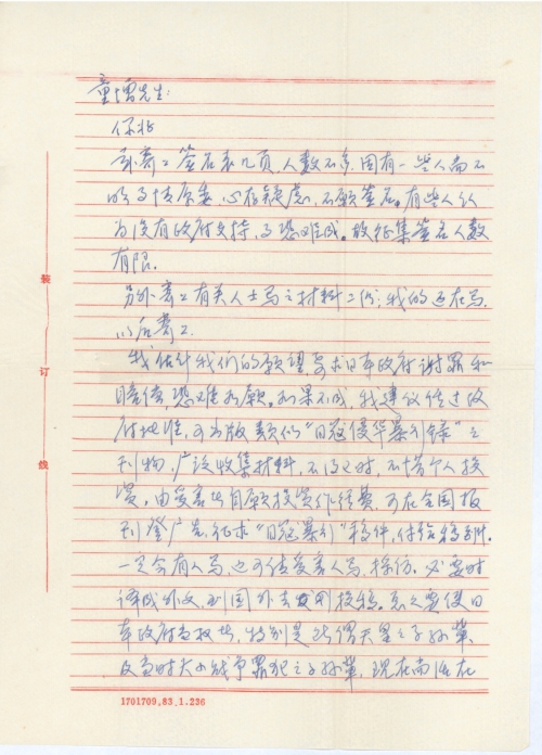 我估计我们的愿望,要求日本政府谢罪和赔偿,恐难如愿。如果不成,我建议经过政府批准,可出版类似“日寇侵华暴行录”之刊物,广泛收集材料,不及多时,不惜个人投资,由受害者自愿投资做经费,可在全国报刊登广告,征求“日寇暴行”稿件,付给稿酬。一定会有人写,也可请受害人写、采访,必要时译成外文,到国外去投稿。总之要使日本政府当权者,特别是所谓天皇之子孙辈,及当时大小战争之子孙辈,现在尚活在人世间的在中国杀人强奸的份子,感到震慑,受到谴责。
