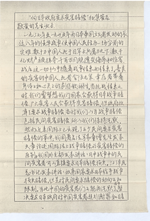 “向日本政府要求受害赔偿”征集签名