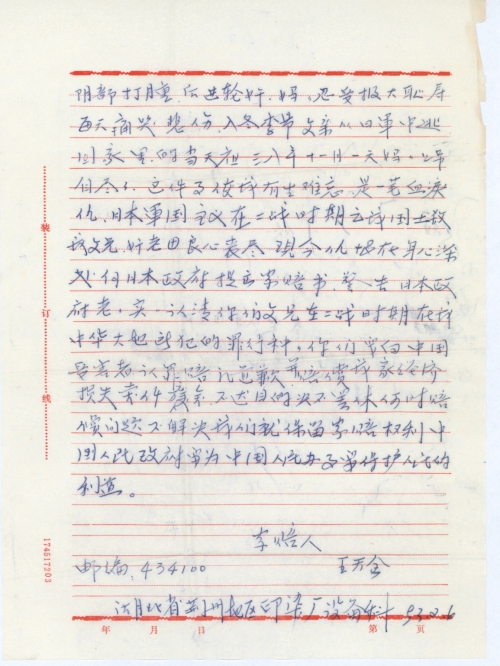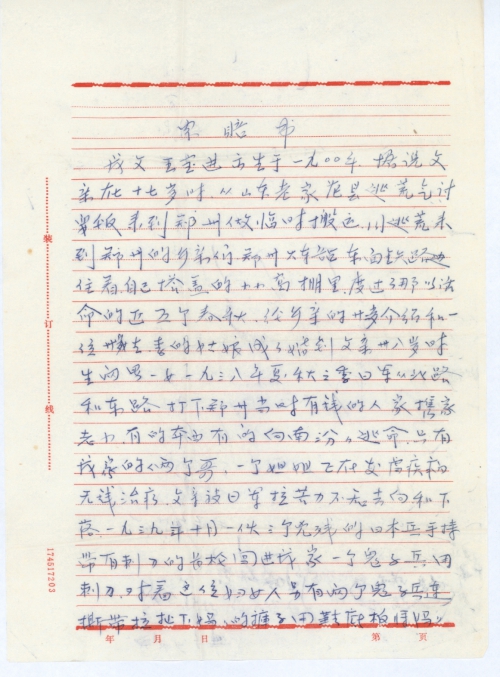 我父王宝金出生于一九〇〇年,据说父亲在十七岁时,从山东老家范县逃荒乞讨要饭,来到郑州做临时搬运,因逃荒来到郑州的乡亲们,郑州火车站东面铁路边住着自己搭盖的小小窝棚里,度过了那以活命的近五个春秋,经乡亲的廿二岁介绍和一位卅岁姓李的姑娘成了婚,到父亲卅八岁时生两男一女。一九三八年夏秋之季,日军从北路和东路打下郑州。当时有钱的人家携家老小有的奔西,有的向南[纷纷]逃命。只有我家的两个哥哥,一个姐姐正在发疟疾病无钱治疗,父亲被日军拉苦力不知去向和下落。一九三九年十月,一伙三个凶残的日本兵手持带有刺刀的长枪闯进我家,一个鬼子兵用刺刀对着这位妇女人,另有两个鬼子兵连撕带拉扯下妈妈的裤子,用鞋底板将妈妈阴部打肿,后进轮奸。妈妈忍受极大耻辱,每天痛哭悲伤,入冬季节,父亲从日军中逃回家里的当天夜。三八年十一月一天妈妈上吊自尽了。这件事使我[永]生难忘,是一笔血泪仇。日本军国主义在二战时期在我国土杀我父兄,奸老母,良心丧尽。现今仇恨在身心深处向日本政府提出索赔书,警告日本政府老老实实认清你们父兄在二战时期在我中华大地所犯的罪行种种。你们要向中国受害者认罪赔礼道歉并赔偿我家经济损失壹千万美元,不达目的决不罢休。何时赔偿问题不解决我们就保留索赔权利。中国人民政府要为中国人民办事,要保护人民的利益。