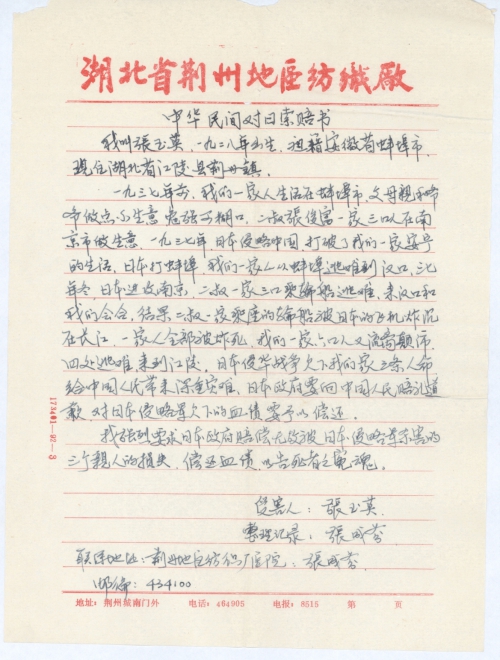 我强烈要求日本政府赔偿无故被日本侵略军杀害的三个亲人的损失,偿还血债,以告死者之冤魂。