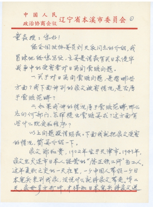 经全国政协委员刘天泉同志的介绍,我冒昧地给您写信,主要是请教有关侵华战争中的受害者对日民间索赔的问题。