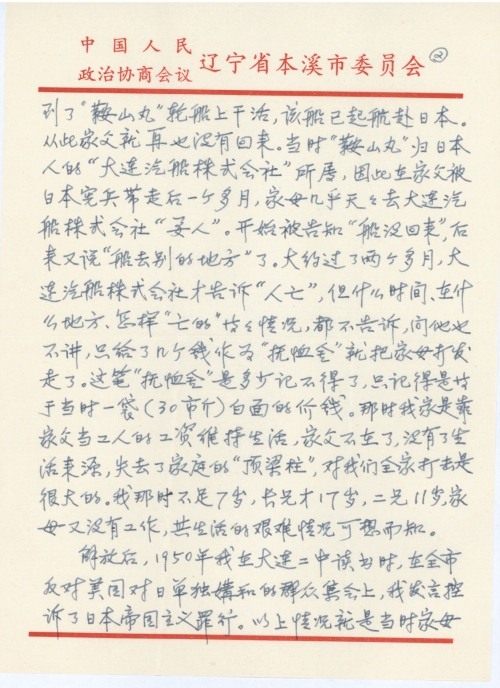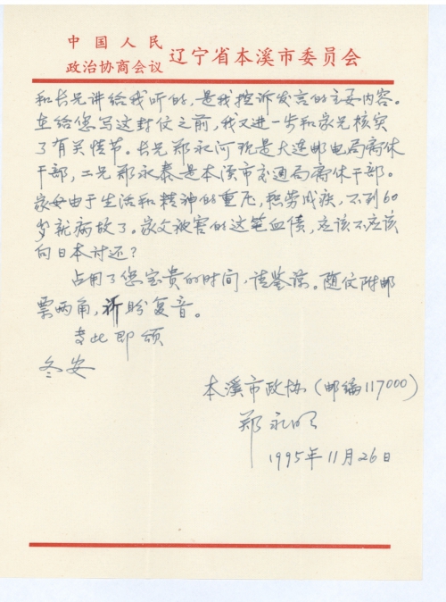 解放后,1950年我在大连二中读书时,在全市反对美国对日单独媾和的群众集会上,我发言控诉了日本帝国主义罪行。以上情况就是当时家母和长兄讲给我听的,是我控诉发言的主要内容。在给您写这封信之前,我又进一步和家兄核实了有关情节。长兄郑永河现是大连邮电局离休干部,二兄郑永泰是本溪市交通局离休干部。家母由于生活和精神的重压,积劳成疾,不到60岁就病故了。家父被害的这笔血债,应该不应该向日本讨还?