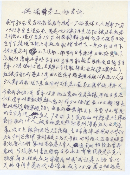 细节:1938年3月分被日本人抓走当劳工,日夜在井下挖煤,日本兵把我送到学习班学习开船技术。日本警察说我是八路军在警察局受尽了折磨。