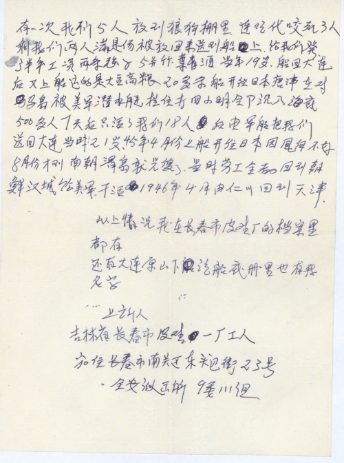 我叫方文学,是吉林省长春市皮鞋一厂的退休工人,现年70岁。1923年生于港家屯。我是1938年3月在沈阳被日本抓劳工到釜山煤矿,当年15岁到南朝鲜。当时的劳工很苦,日夜在井下挖煤,不能上井,死后就埋在井下。一年后我由井下调上来送到山下汽船,船开到日本唐津,又把我送山下汽船住唐津办事处学习班学习开船技术。因我会日语,学习半年,17岁回大连关东军山下汽船株式会社(劳工集中站),后被分配到营丸1号回大连。途中船遇难全船16人死11人活5人,其中有我活下来,后回到大连东山庄劳工集中站。半年又分配到柳丸1号,当年18岁。船上装的全是高粮,开往日本左士保。途中到南朝鲜群山岛,到约50海里,和10几艘潜水艇[相]遇上,3艘军舰跑了,把我们7条船留下不管,4小时我们全部打沉,140多人7天后除了受伤的叫鲸鱼吃掉的剩下我们18人。被当地的渔民救起送到渭岛,后返回大连。第二次有上船,柳丸运大豆高粮,去日本唐津,因风向不对25天后才到达唐津。当时我是三老大开船,那时候人没有实姓名,我的登记册写的老家是山东人,写实的怕给家里人找麻烦,可没想到差点要命。日本水上警察说我是山东八路探子,把我抓到警察局叫我承认是八路。在15天的审问中连打代喝凉水,死了15回。最可怕的是,有一次我们5人放到狼狗棚里,连吃带咬死3人,剩我们两人满是伤被放回来送到船上,给我们发了半年工资两条毯子5瓶竹叶青酒。当年19岁,船回大连后又上船,运的是大豆高粱。20多条船开往日本唐津,在对马岛被美军潜水艇拦住,打四小时,全部沉入海底。500多人7天后只活了我们18人,后由军舰把我们送回大连,当时21岁。45年4月份上船开往日本,因风向不好8月份才到南朝鲜渭岛就光复了,当时劳工全都回到朝鲜汉城给美军干活。1946年4月由仁川回到天津。