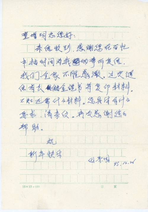21 10 月, 2018 s0698 Share EmailTwitterFacebookGoogle +PinterestTumblrLinkedinVkontakte 信扫描序列号:s0698 写信日期:1995-12-26 写信地址:吉林省辽源市 受害日期:不详 受害地址:不详 写信人:田景园 受害人:田景园 类别:其它(OT) 细节:这次寄信寄来储金证书的复印件,询问还需要什么材料下次一同寄来。 童增同志: 您好! 来信收到。感谢您在百忙中抽时间为我的事而复信,我们全家不胜感激。这次随信寄去储金证书等复印材料。不知还需什么材料。您具体有什么要求。请来信,再次感谢您的帮助。 祝: 新年快乐! 田景园 95.12.26 21 10 月, 2018 10000cfj_3o5som 其它(OT)