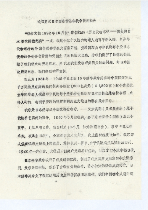 “读者文摘1992年10月刊”李佩钰的“历史没有忘记——国人向日本要求赔偿纪实”一文,我这个五十又挂六的老人通宵不能入睡。多少年没拿笔杆的手出于受害损失太深激了情。童增同志为中华民族每个受日本侵华战争受害者着想的爱国主义的民族大义感,为我们撬开了法律的铁锁,给了我们极大的开导启示,并代表我们受害者共同关注的问题,向日本国政府提出来,我们热烈响应支持。