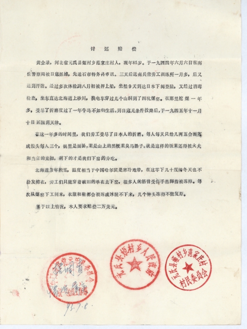 细节:1944年在家乡被日寇抓捕,先审讯,三天后在劳工训练所训练一个月后被押送到日本挖煤一年多,受尽了折磨,度过了一年牛马不如的生活。本人要求日本政府对我赔偿。备注信封丢失
