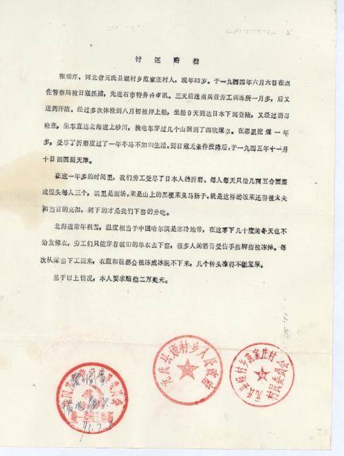 细节:1944年被日寇抓捕后送到日本做苦力1年多,在这一年多里受尽了折磨。基于这些情况我要求日本政府赔偿我所有的损失。备注信封丢失
