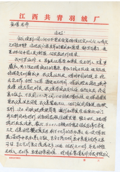 我叫罗淑珍,女,家乡原江苏省如皋县花子街人。父亲罗殿成,为了阻止日军疯狂的屠杀,参加了抗日队伍。这支队伍指挥员名叫薛成中,我父亲任队长。日军对中国的烧、杀、抢,无恶不作,当然,江苏海安也不例外。日军战船在海边横冲直撞,炮击岸边村民。我父亲带领这支队伍奋起反击,终因寡不敌众,于民国二十八年七月二十四日被日军抓住,这日军指挥官要我父亲供出同党,我父亲誓死不从,他们就用皮鞭、烙铁等刑,次日,用铁链横穿肩骨,游行如皋县东西南北四门。并不断用枪把打,用香烟屁股往腰里塞。整整四天,被日军拷打死去活来,最后,于二十八日被日本鬼子很长东洋刀杀害。不久,母亲因悲愤过度去世,剩下十几岁的我和弟弟。在一次日军狂轰滥炸中,我和弟弟分散,至今下落不明。家中房屋被炸,无家可归,至后乞讨度日流落他乡江西。现我六十四岁,年老体弱,无收入,无工作,家里非常困难。特请求童增老师为我[伸]张正义。要求日本方面对我家进行赔偿。