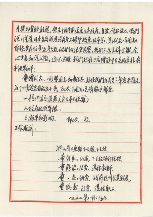 我们打算把上述情况写成详细材料,附七百余人签名复印表,并提出索赔数额,赶在十月份前递交日本政府。当然,请你放心,我们深深懂得,日本当局成员没有参与侵华战争。日本第二、第三代更一无所知。即使幸存的年迈参与者,他们也深受其害。我们不会言辞过激,会心平气和说问题。通过索赔,我们相信只会增进中日友好交往,有利世界和平!