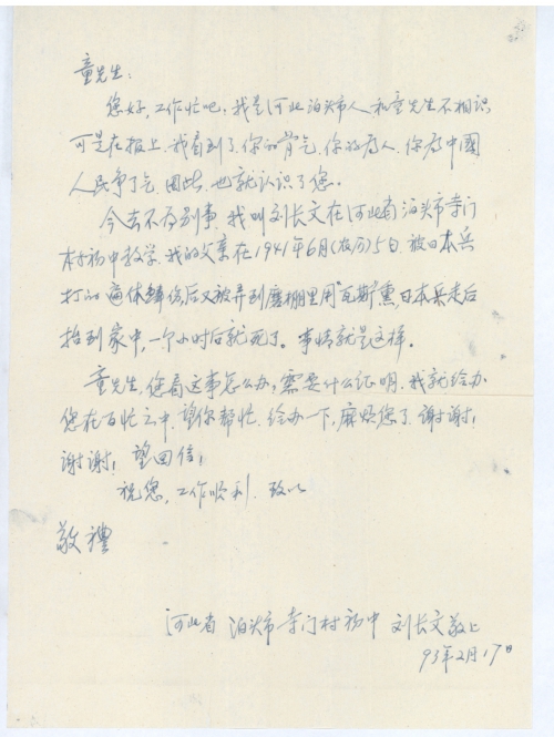 今去不为别事。我叫刘长文,在河北省泊头市寺门村初中教学。我的父亲在1941年6月(农历)5日,被日本兵打得遍体鳞伤,后又被弄到磨棚里用“瓦斯”熏,日本兵走后抬到家中,一个小时后就死了。事情就是这样。