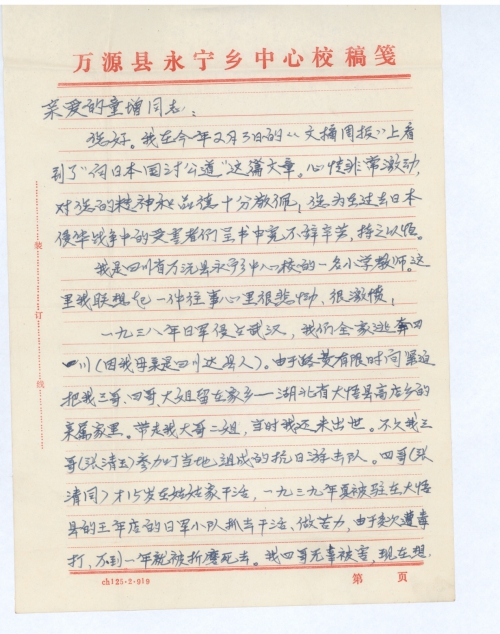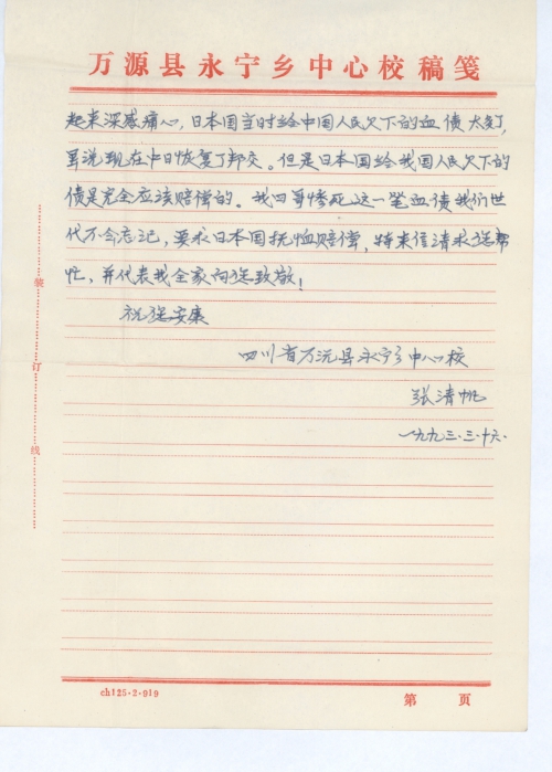 一九三八年日军侵占武汉,我们全家逃奔四川(因我母亲是四川达县人)。由于路费有限,时间紧迫,把我三哥、四哥、大姐留在家乡——湖北省大悟县高店乡的亲属家里。带走我大哥、二姐,当时我还未出世。不久我三哥(张清玉)参加了当地组成的抗日游击队。四哥(张清同)才15岁,在姑姑家干活,一九三九年夏被驻在大悟县的王年店的日军小队抓去干活、做苦力,由于多次遭毒打,不到一年就被折磨死去。我四哥无辜被害,现在想起来深感痛心,日本国当时给中国人民欠下的血债太多了,虽说现在中日恢复了邦交,但是日本国给我国人民欠下的债是完全应该赔偿的。我四哥惨死这一笔血债我们世代不会忘记,要求日本国抚恤赔偿,特来信请求您帮忙,并代表我全家向您致敬!