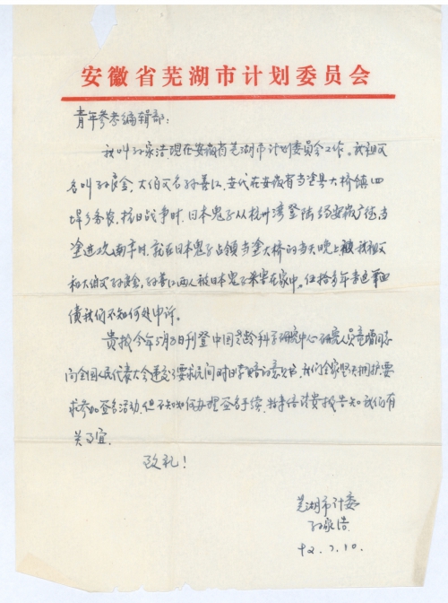 我叫孙家浩,现在安徽省芜湖市计划委员会工作。我祖父名叫孙良金,大伯父名孙善江,世代在安徽省当涂县大桥镇四垾乡务农。抗日战争时,日本鬼子从杭州湾登陆经安徽广德、当涂进攻南京时,就在日本鬼子占领当涂大桥的当天晚上,我祖父和大伯父孙良金、孙善江两人被日本鬼子杀害在家中。伍拾多年来这笔血债我们不知何处申诉。