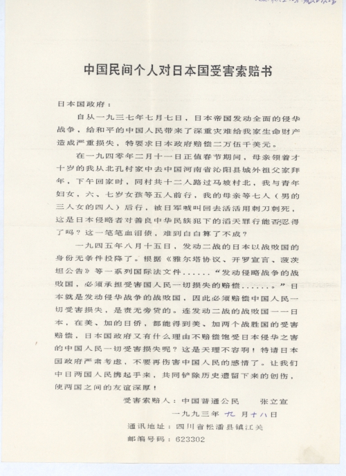 1.I am sending you each copy of the letters of claim for civilian compensation against Japan by Zhang Lixuan and Zhang Lixian respectively and two signature lists. Zhang Lixuan’s brother-in-law has personally submitted the claim letter to the Japanese Embassy in China in Beijing.