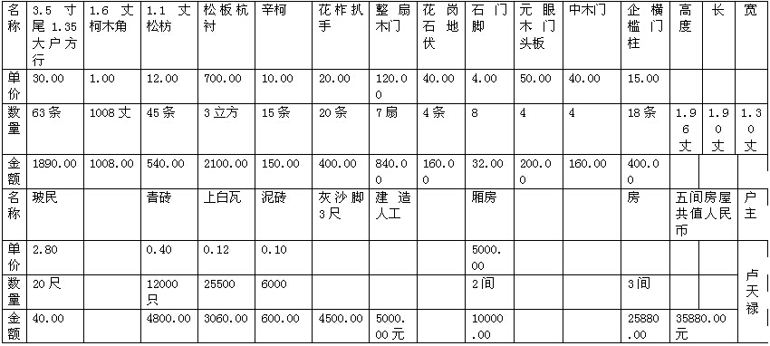 卢屋公家被烧头厅和二厅两间正座每间造价7500.00元,又供奉神台一具雕花铂金值5000.00元,两间厅15000.00元+5000.00元=20000.00元人民币,伸算合2464.00美元