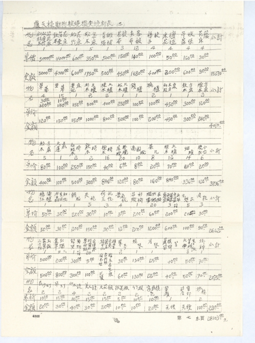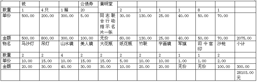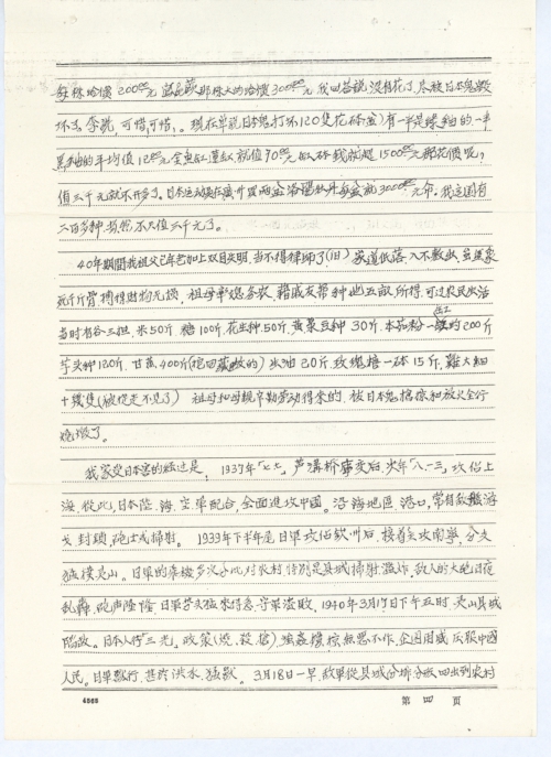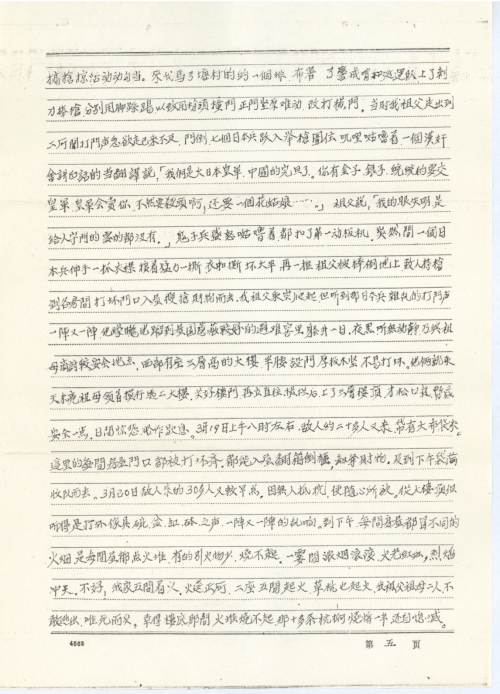 40年期间,我祖父已年老加上双目失明,当不得律师了(旧),家道低落,入不敷出,虽然象死千斤骨,搏得财物无损。祖母率媳务农,籍戚友帮种地五亩,所得可过农民生活。当时有谷三担、米50斤、糖100斤、花生种50斤、黄绿豆种30斤、本茹粉一缸约200斤、芋头种120斤、甘蔗400斤(挖回藏做的)、生油20斤、玫瑰糖一钵15斤,鸡大细十几只(被捉走不见了)。祖母和母亲辛勤劳动得来的,被日本鬼抢掠和放火全行烧毁了。