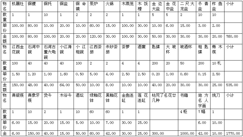 卢天禄财物被烧损失统计表(二)