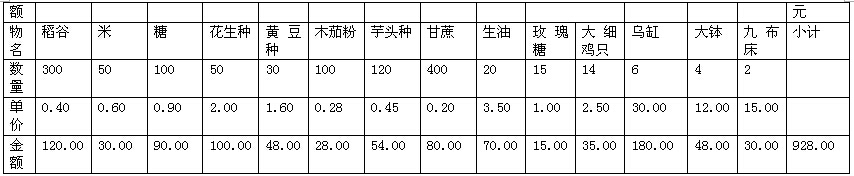 卢爵冲户被烧草炕一只,谷种200斤,花生种150斤,豆种100斤,合计590.00元人民币,伸算合73.20美元。