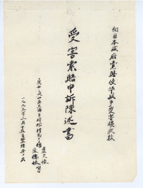 我们灵山才陷敌三天,日军就这样作恶,中国很多的地方陷敌几年好几年,总之比我们长得多。有的人也死了,甚至大小死齐。更好的房屋被炸毁、被烧毁,财产全部损失或更大。所受的痛苦是多么深惨,谁说不要日本赔偿,这是错误的。我们不到他那里去犯他,而他从几千里外渡海渡洋而来,来我们中国杀人放火、抢掠、强奸,中国无辜的死成千上万,毁了几百万间房屋和难以计得清的财产。从黄帝立国五千多年里,改朝换代,农民暴动,都没有过这么[残]酷。这是中华民族的最大浩劫,也是旧中国的奇耻大辱。超过65岁的人是有点热血的,都无比愤怒和仇恨。忆当年所谓日本大皇军是何等猖狂,大队飞机任意轰炸城市、乡村。大队军队任意炮击中国的港口、要塞、渔民。几百万装备精良的陆军想攻占哪里就攻占哪里。南京大屠杀中国人就无辜被杀30万人之多,真是骇人所闻和发指。百年来日本要人从天皇昭和到裕仁,首相田中伊滕博文、东条英机,武将重井、崇光癸、岡川宁次等,都是野心勃勃的野心家,无视中华民族的伟大正义、热爱和平。日本军人在中国神圣领土上犯了不可饶恕的滔天大罪,日本政府就有承担责任。中国受害损失3000亿美元,民间受害损失1800亿美元,不能减免。侵略者的下场,战败的日本要赖玩弄什么花招,一直拖了五十多年还不赔,我们受害者是忍受不住了。我们受害者会呐喊,一定要日本政府赔。索赔,我们受害者要团结起来,倾诉日本侵略军的罪行。我们签名有力地向日本政府索赔。我们希望各级领导大力支持,开展清算受害损失账。通过深、细的发动群众,乡县会获得更丰富的资料,汇集到中央。站了起来的中国人民,在伟大的、正确的、光荣的中国共产党和江泽民总书记和李鹏总理及中央各首长的领导下,进行一场向日本政府索赔运动。要有声有色,声势浩大,轰动起全国人民群众,震撼日本,震撼世界。直搞到日本政府接受赔款条件,签字赔款,拨款为止,才算取得彻底的胜利。才能对得起被日军惨杀死者在天之灵。我们才配称炎黄子孙,才能对得起历代圣明君主秦皇、汉武、唐宗、宋祖。以及革命伟人孙中山、毛主席和民族英雄、爱国贤人、抗战卫国死难烈士。