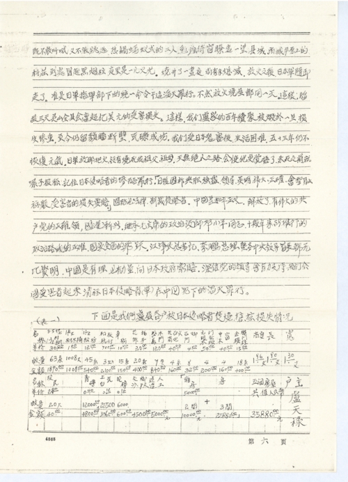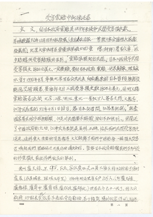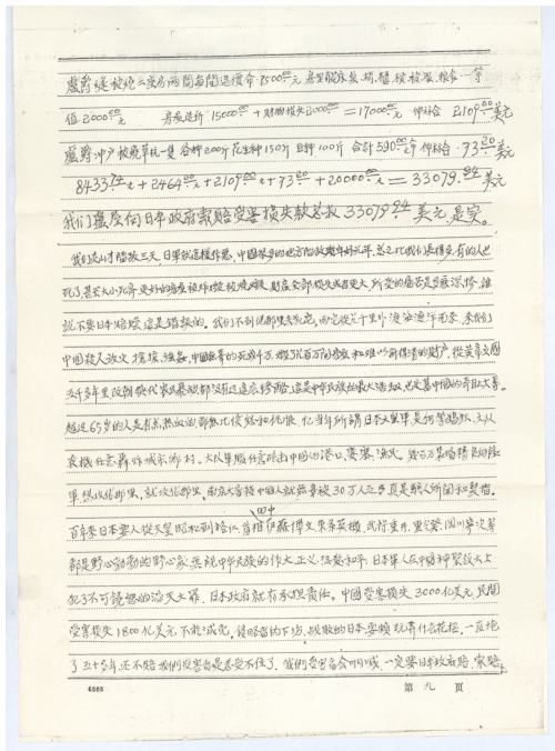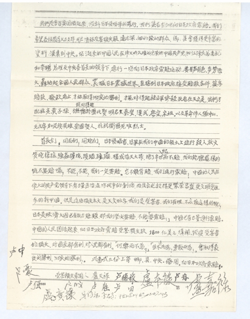 首长们!同志们!同胞们!日本侵略者、日军在我们中国的领土上进行杀人、放火、焚烧抢掠、强奸掳掠、践踏蹂躏,构成滔天大罪。拖了半世纪而不赔,我们能慷这样的慨还要赔吗?不能!不能!我们一定要赔。它不肯赔,我们进行索赔!中国的人民在伟大的共产党领导下,有力量医治这场战争的创伤,而且会建设得更繁荣昌盛,更文明进步的新中国。但是这场损失太大,是天文数字。我们是受害者,我们有理,不应慷这样的慨!日本是经济大国,也有能力赔偿。那我们坚决要赔。不给「要索赔!」中国也有力量进行索赔。中国的人民团结起来,向日本政府索赔受害损失款1800美元。填补、恢复受害者的损失,对国家都有利,对人民都有利。「何乐而不为?」「当尽力而为!勇敢而为!」会取得最后的胜利、彻底的胜利!此壹式三份上寄乡、县、中央备用。向日本政府索赔。