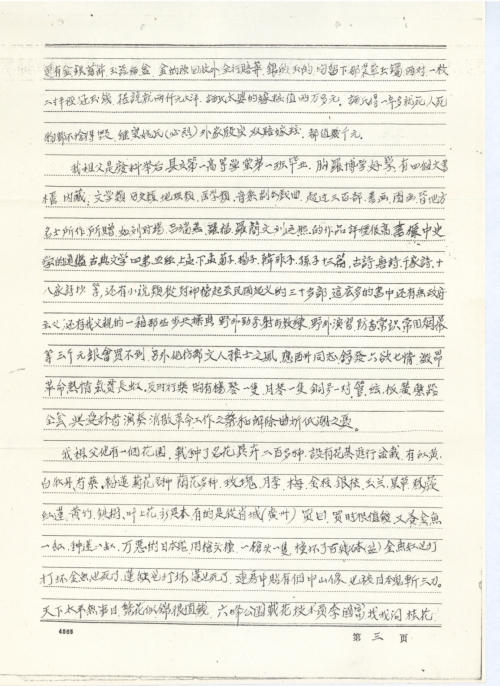 我祖父他有一个花园,栽种了名花异卉二百多种。设有花基,进行盆栽。有红、黄、白牡丹、芍药、粉莲、菊花多种,兰花多种,玫瑰、月季、梅、金桂、银桂、玉兰、星草、凤蕨、红莲、黄竹、铁树、叶上花、新异木,有的是从省城(广州)买回,买时很值钱。又养金鱼一缸、种莲一缸。万恶的日本鬼用枪头撞,一枪头一只,撞坏了百几钵(盆),金鱼缸也打坏,金鱼也死了。莲缸也打坏,莲也死了。连房中贴有个中山像,也被日本鬼斩三刀。天下太平无事日,繁花似锦很值钱,六峰公园栽花技术员李国富,找我问桂花每株给价200.00元,凤尾蕨那株大的给价300.00元。我回答说,没有花了,尽被日本鬼毁坏了。李说,可惜可惜。现在单说日本鬼打坏120只花钵(盆),有一半是绿釉的一半黑釉的,平均值12.00元。金鱼缸、莲缸,就值70.00元,缸钵钱就超1500.00元,那花价呢?值三千元就不开多了。日本运动员在广州买两盆洛阳牡丹,每盆就3000.00元人民币。我这园有二百多种,当然不只值三千元了。