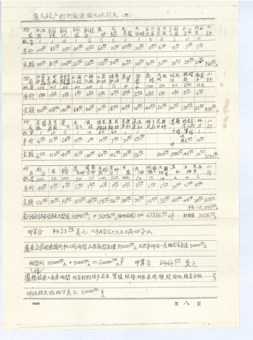 卢爵燧被烧二座房两间每间造价人民币7500.00元,房内有花床、桌椅、柜、槓、被服、粮食……等,值2000.00元。房屋造价15000.00+财物损失2000.00=17000.00元,伸算合2109.00美元。