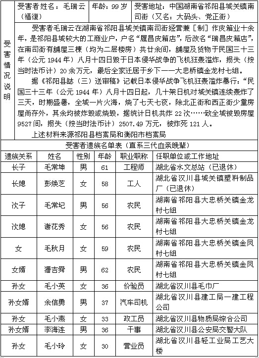 细节:父亲在祁阳县做皮箱生意。1944年被日本飞机狂轰乱炸,损失惨重,最后全家人只能迁居乡下。现要求日本对我家赔偿一切损失。