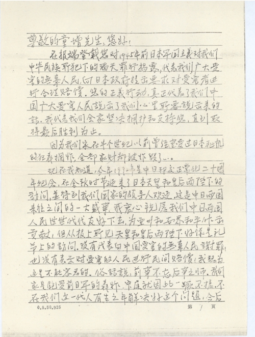 According to newspaper reports, you revealed the towering crimes committed by the Japanese Militarism before 1945 against our Chinese people, and represented our innocent victims to demand the Japanese government to give reasonable compensation to victims. Your righteous actions truly represent our Chinese victims, and speak out the words long pent up in our heart. On behalf of my whole family, I resolutely support you, till the moment when we score the final success.