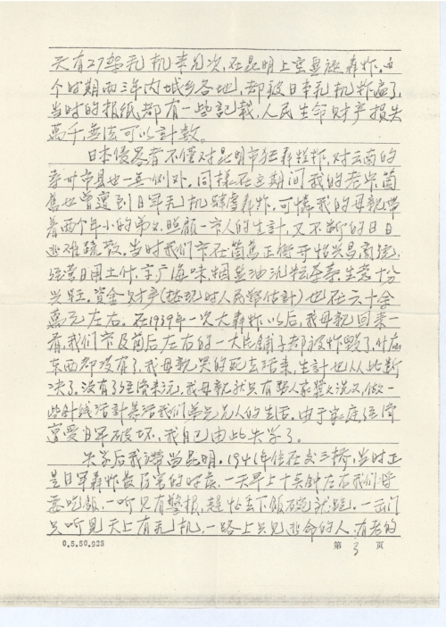 Although we fled to the countryside, we still could not study very peacefully. This is because Japanese aircrafts still continually bombarded Kunming city, sometimes once each day, sometimes multiple times each day. First in early morning a reconnaissance aircraft would arrive in the air above Kunming, followed by bombers which dropped bombs. Sometimes 3-5 aircrafts would come each time, and sometimes 9 aircrafts in pyramid formation would cross the sky. In one extreme case one day as many as 27 aircrafts came several times, circling Kunming in the air and dropping bombs. During this period, within two and three years, everywhere either in the city or in the countryside received bombing from Japanese aircrafts. Newspapers at that time published some articles showing that people sustained loss of life and property amounting to millions, the damage being too numerous to count.