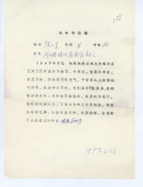 1943年3月,我被骗到日本九州[熊]本县三井三池矿业下煤窑,做苦力。整整两年多。分文不给,还经常挨打受气,干着累死人的活还吃不饱,真是牛马不如。我们离开祖国家乡,有的被活活打死;有的被瓦斯烧死,真是[惨]不忍睹。我们活过来的人,1945年10月回国。现在我年[事]已高,要在有生之年,讨回公道,要求给予人道主义的补偿。日元600万。