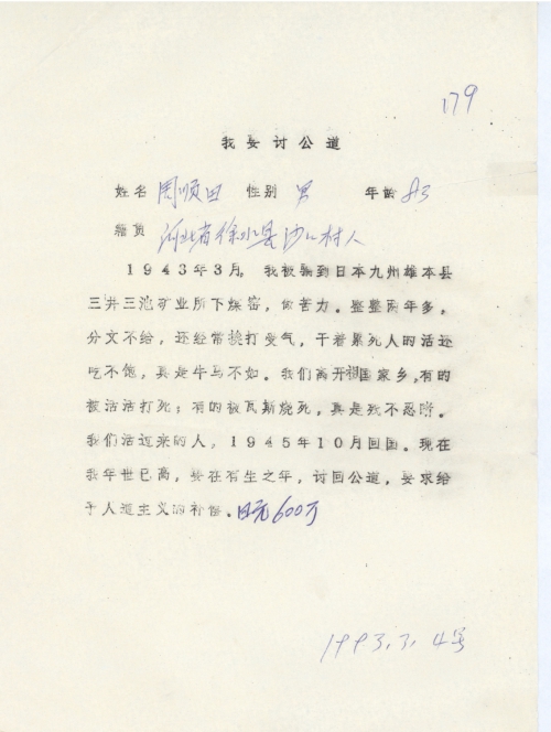 1943年3月,我被骗到日本九州[熊]本县三井三池矿业下煤窑,做苦力。整整两年多。分文不给,还经常挨打受气,干着累死人的活还吃不饱,真是牛马不如。我们离开祖国家乡,有的被活活打死;有的被瓦斯烧死,真是[惨]不忍睹。我们活过来的人,1945年10月回国。现在我年[事]已高,要在有生之年,讨回公道,要求给予人道主义的补偿。日元600万。