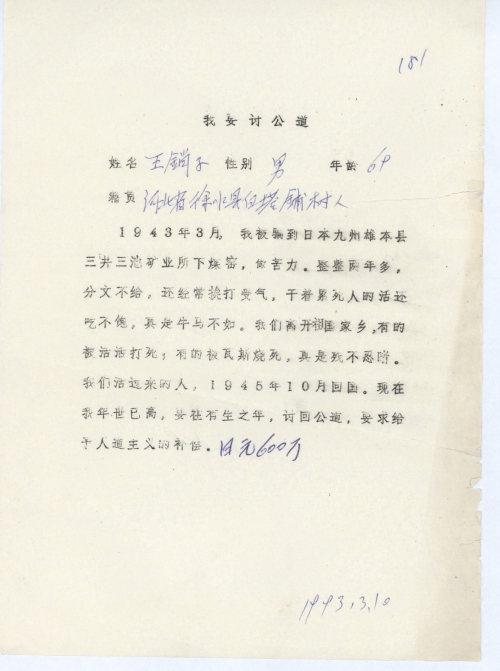 1943年3月,我被骗到日本九州[熊]本县三井三池矿业所下煤窑,做苦力。整整两年多,分文不给,还经常挨打受气,干着累死人的活还吃不饱,真是牛马不如。我们离开祖国家乡,有的被活活打死,有的被瓦斯烧死,真是[惨]不忍睹。我们活过来的人,1945年10月回国。现在我年[事]已高,要在有生之年,讨回公道,要求给予人道主义的补偿。日元600万。